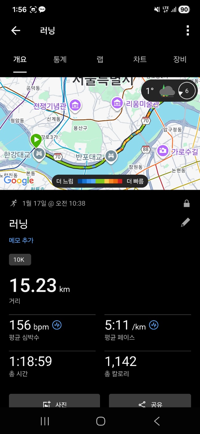 그날의 1km 속도는 눈에 띄게 빨랐고, 완주 시간도 평균보다 빠르게 끝났다.